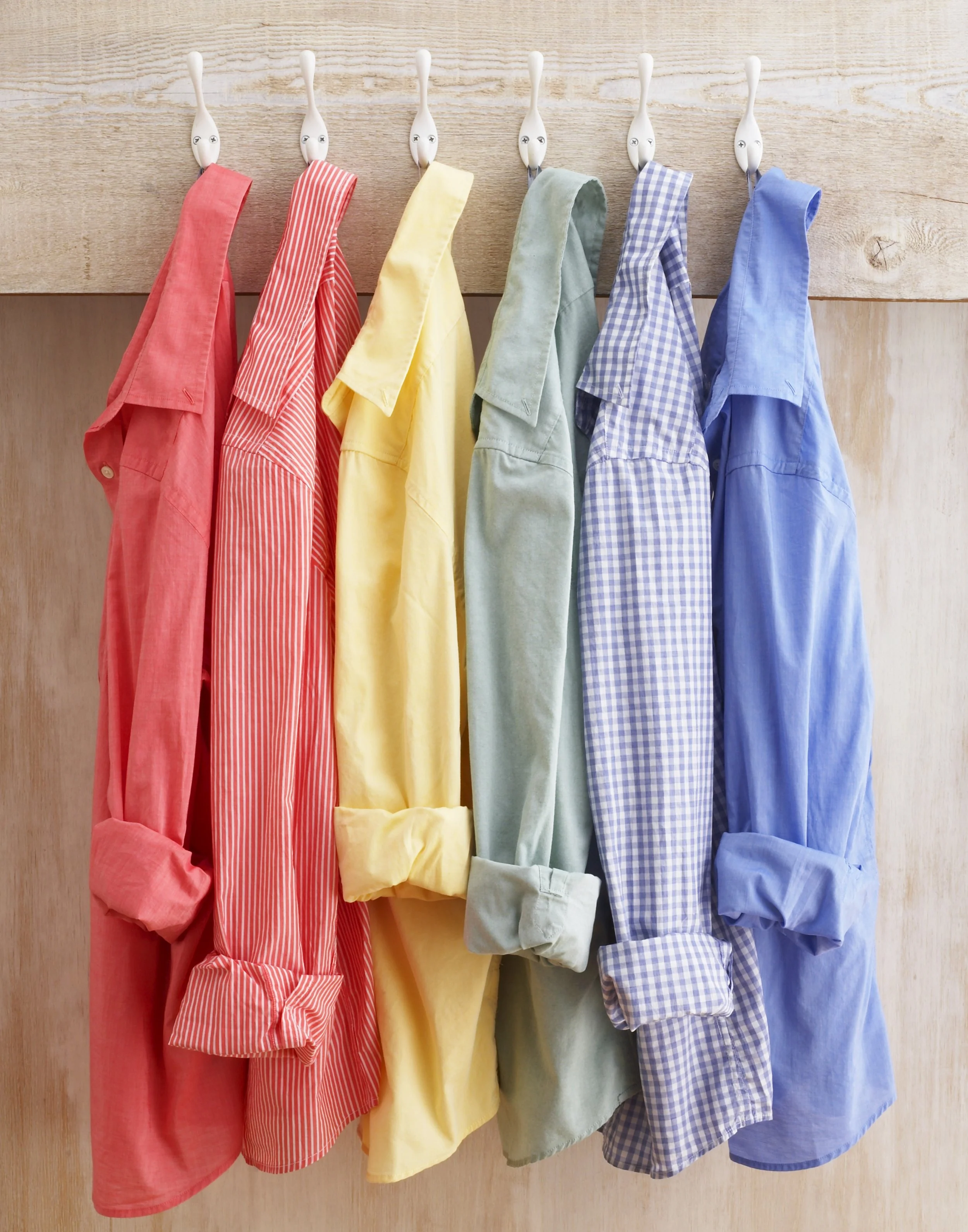 Six colorful shirts hanging on hooks against a wooden background, from left to right: coral, red and white striped, yellow, light green, blue and white checkered, and solid blue.
